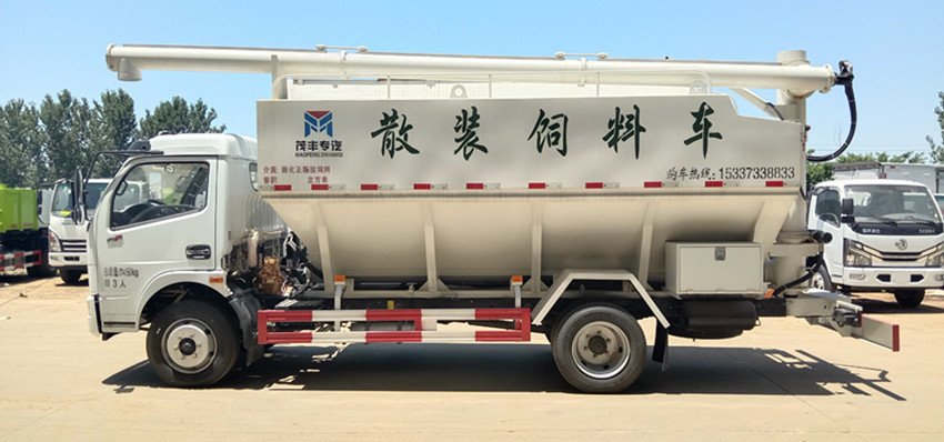散裝飼料運輸車,散裝飼料車的飼料罐架設在卡車的底盤上,罐頂開有進料口.頂部的一根螺旋輸送卸料管(俗稱卸料絞龍)則可自由回轉和抬升,抬升的仰角可達60度。運輸時,頂部的螺旋管平臥在罐頂;卸料時則抬起,使管端的出料口與畜禽飼養(yǎng)場貯料罐頂部的進料門相接,駕駛室內(nèi)裝有操縱裝置(操縱裝置也可裝置在罐體尾部),卸料時通過車底的動力輸出軸和減速器來驅動螺旋,以完成卸料。