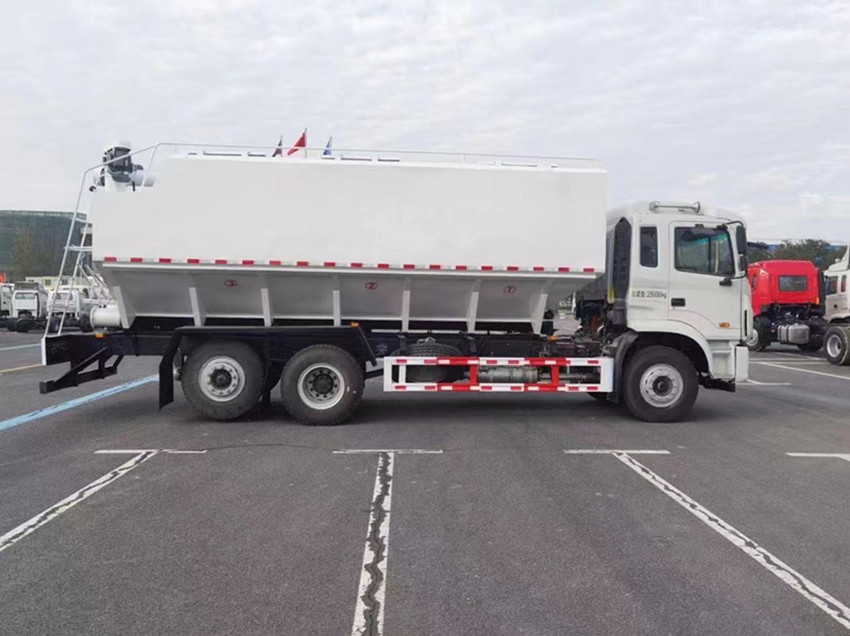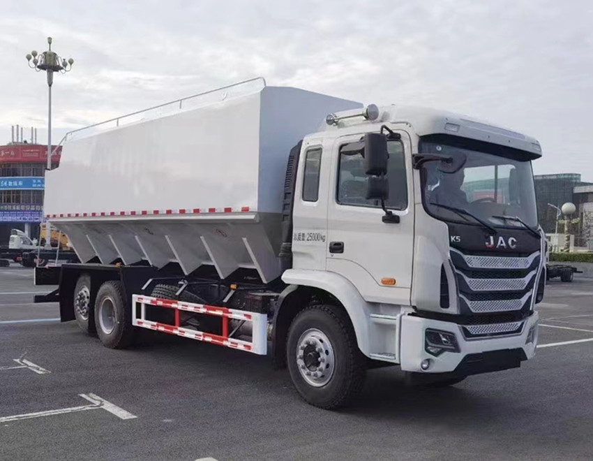 散裝飼料運輸車,散裝飼料車的飼料罐架設在卡車的底盤上,罐頂開有進料口.頂部的一根螺旋輸送卸料管(俗稱卸料絞龍)則可自由回轉和抬升,抬升的仰角可達60度。運輸時,頂部的螺旋管平臥在罐頂;卸料時則抬起,使管端的出料口與畜禽飼養(yǎng)場貯料罐頂部的進料門相接,駕駛室內裝有操縱裝置(操縱裝置也可裝置在罐體尾部),卸料時通過車底的動力輸出軸和減速器來驅動螺旋,以完成卸料。