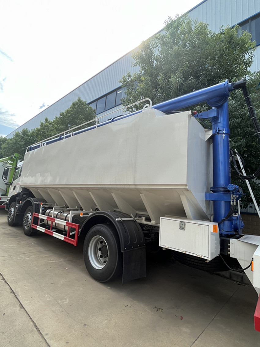 散裝飼料運(yùn)輸車,散裝飼料車的飼料罐架設(shè)在卡車的底盤上,罐頂開有進(jìn)料口.頂部的一根螺旋輸送卸料管(俗稱卸料絞龍)則可自由回轉(zhuǎn)和抬升,抬升的仰角可達(dá)60度。運(yùn)輸時(shí),頂部的螺旋管平臥在罐頂;卸料時(shí)則抬起,使管端的出料口與畜禽飼養(yǎng)場貯料罐頂部的進(jìn)料門相接,駕駛室內(nèi)裝有操縱裝置(操縱裝置也可裝置在罐體尾部),卸料時(shí)通過車底的動(dòng)力輸出軸和減速器來驅(qū)動(dòng)螺旋,以完成卸料。