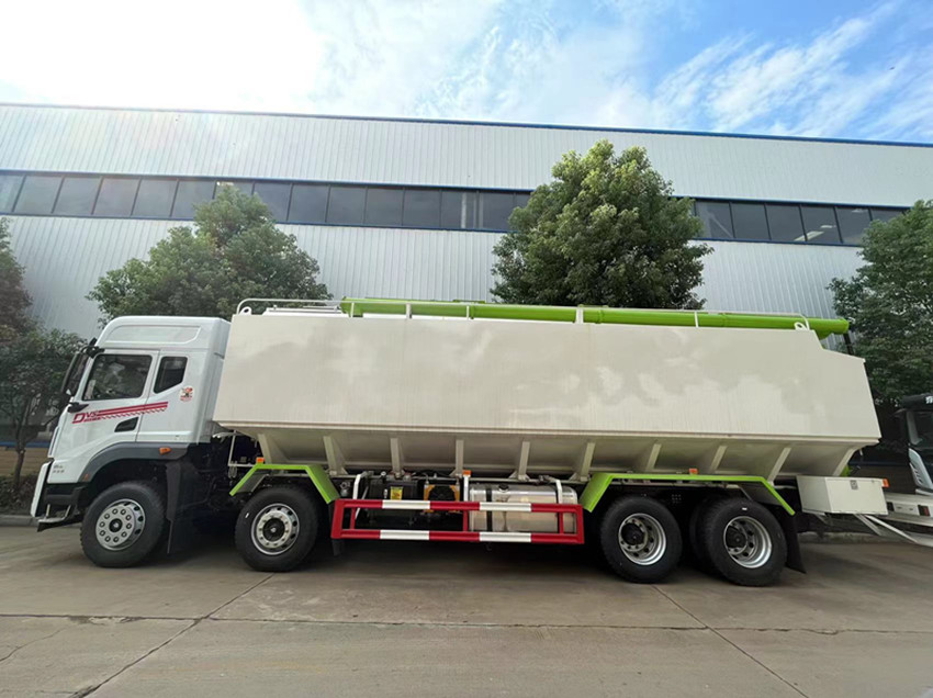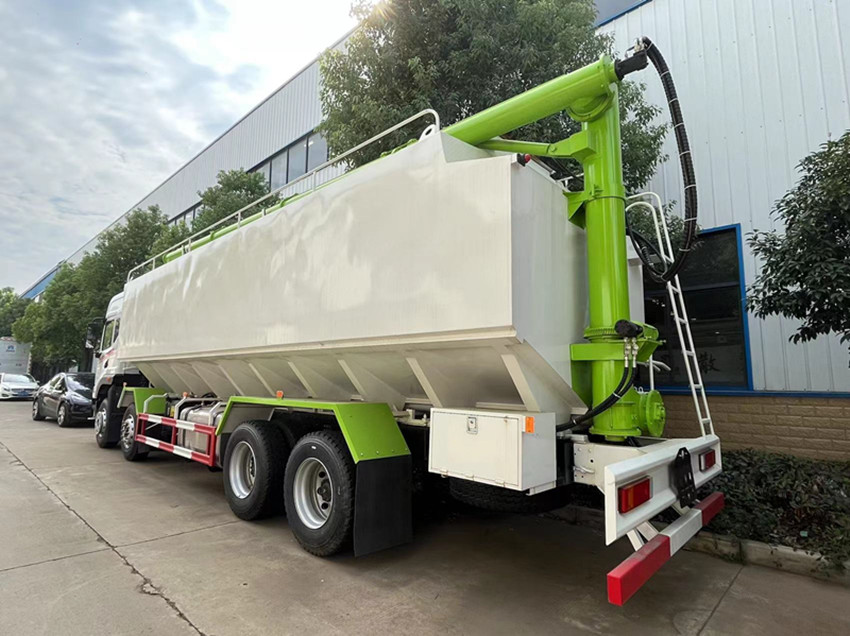散裝飼料運輸車,散裝飼料車的飼料罐架設在卡車的底盤上,罐頂開有進料口.頂部的一根螺旋輸送卸料管(俗稱卸料絞龍)則可自由回轉和抬升,抬升的仰角可達60度。運輸時,頂部的螺旋管平臥在罐頂;卸料時則抬起,使管端的出料口與畜禽飼養(yǎng)場貯料罐頂部的進料門相接,駕駛室內裝有操縱裝置(操縱裝置也可裝置在罐體尾部),卸料時通過車底的動力輸出軸和減速器來驅動螺旋,以完成卸料。