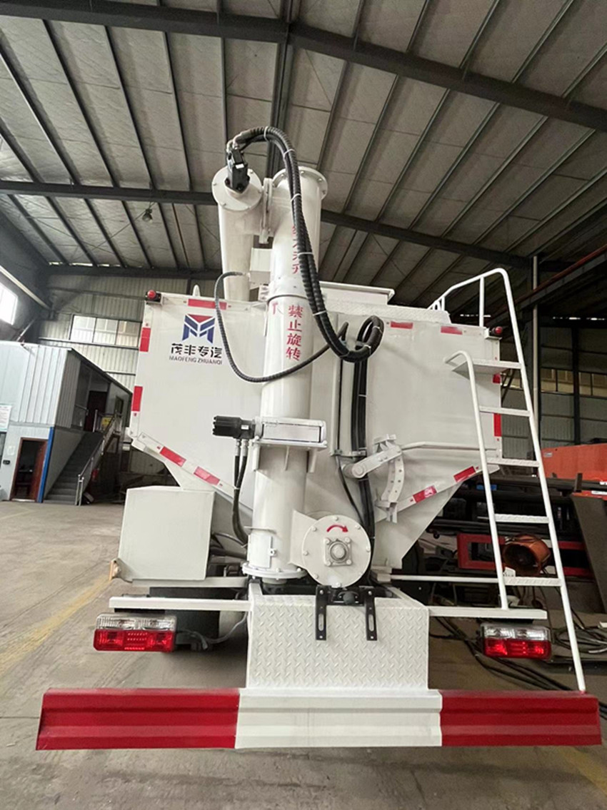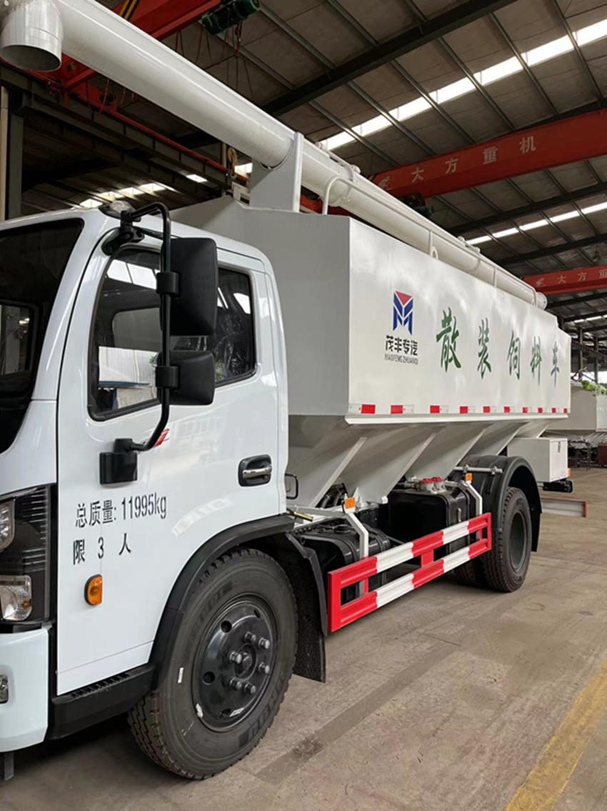 散裝飼料運(yùn)輸車,散裝飼料車的飼料罐架設(shè)在卡車的底盤上,罐頂開有進(jìn)料口.頂部的一根螺旋輸送卸料管(俗稱卸料絞龍)則可自由回轉(zhuǎn)和抬升,抬升的仰角可達(dá)60度。運(yùn)輸時,頂部的螺旋管平臥在罐頂;卸料時則抬起,使管端的出料口與畜禽飼養(yǎng)場貯料罐頂部的進(jìn)料門相接,駕駛室內(nèi)裝有操縱裝置(操縱裝置也可裝置在罐體尾部),卸料時通過車底的動力輸出軸和減速器來驅(qū)動螺旋,以完成卸料。